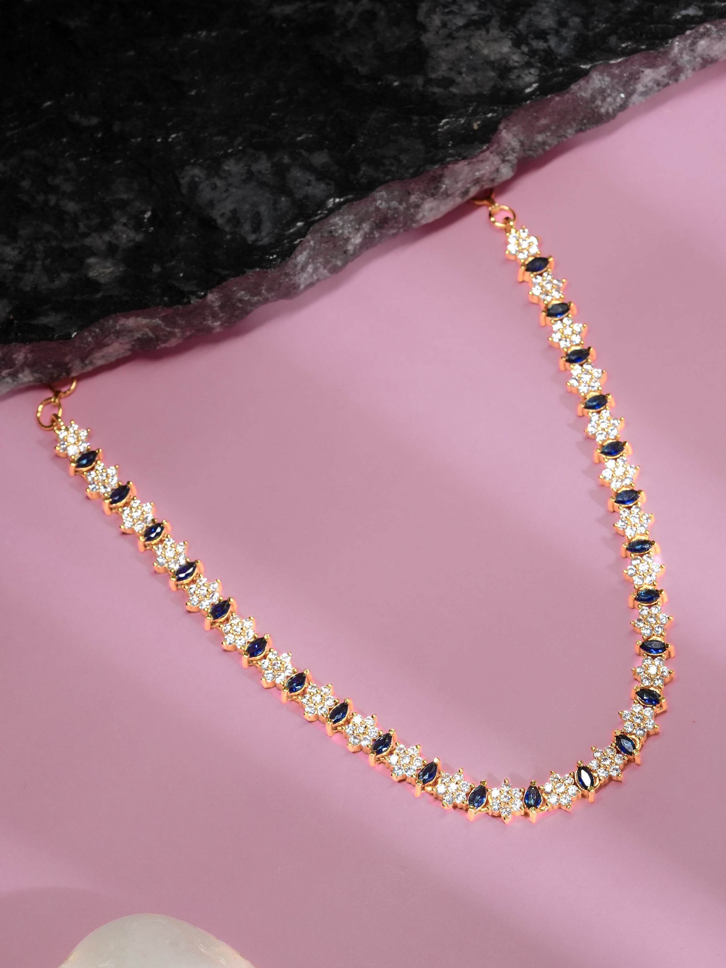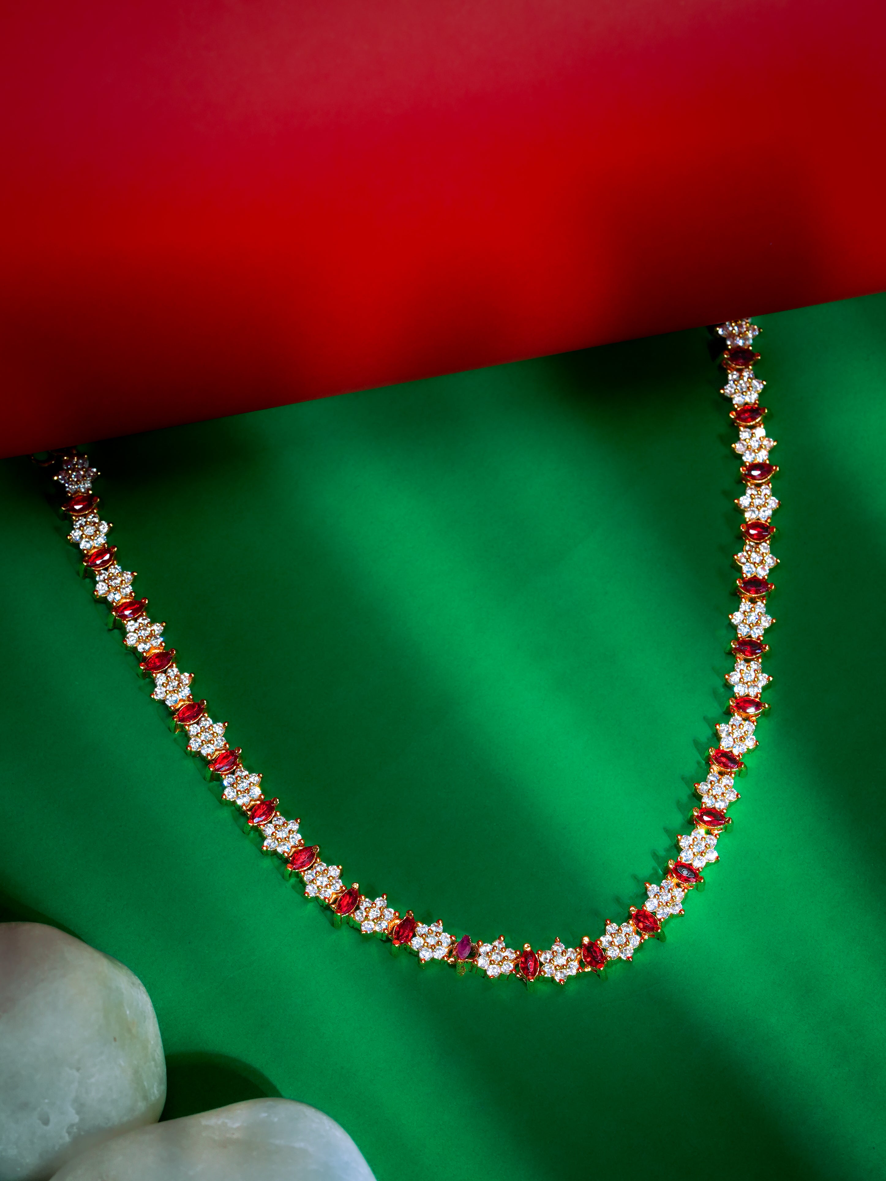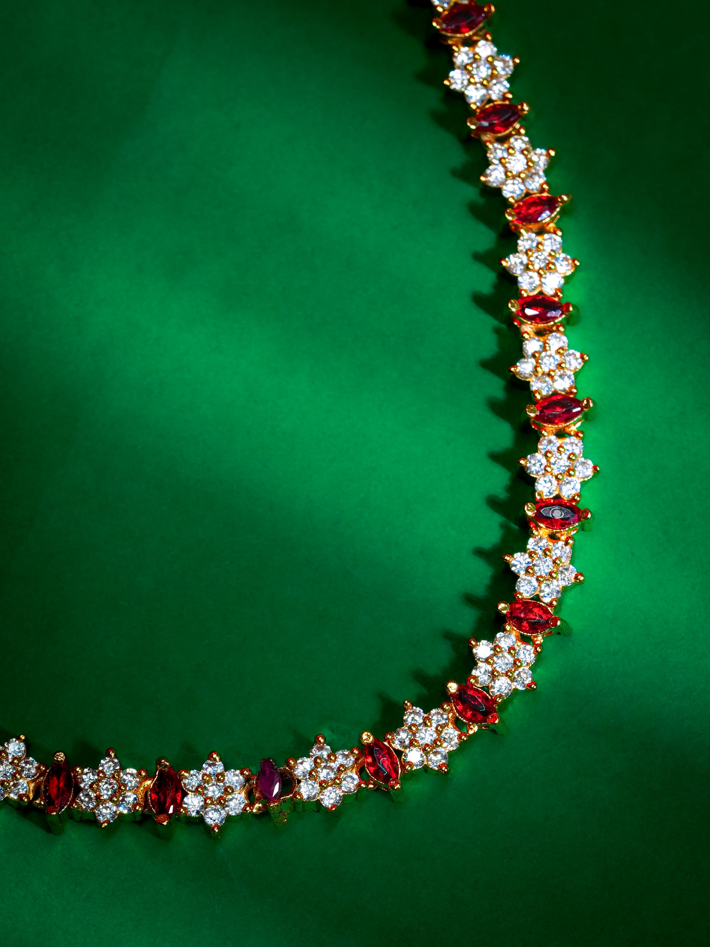 A graceful blend of tradition and sparkle, this necklace brings back the timeless charm of old Bengaluru jewellery styles. Featuring alternating ruby-toned marquise stones and sparkling CZ floral clusters, the design sits beautifully on the neckline, offering a rich yet delicate look.