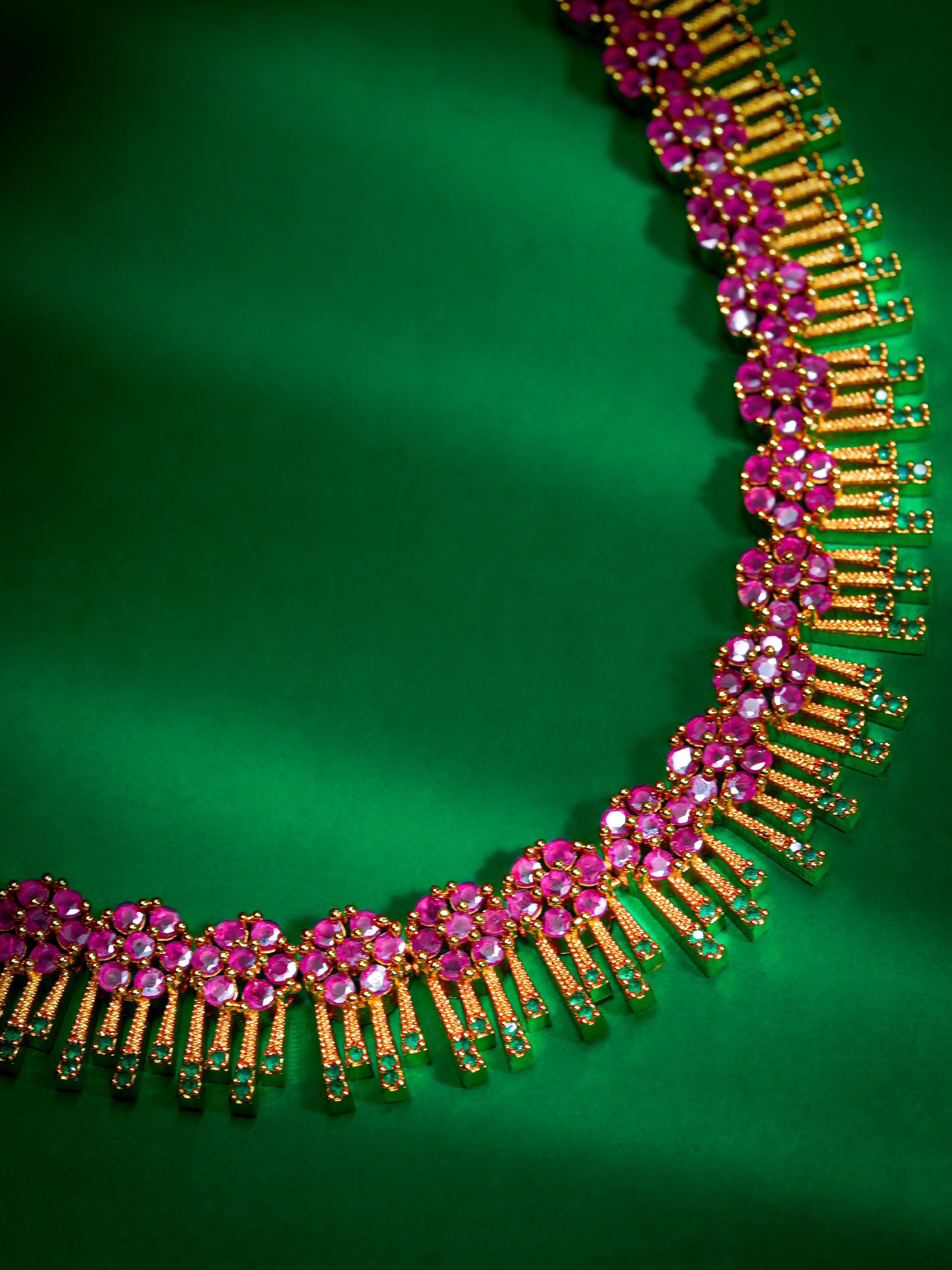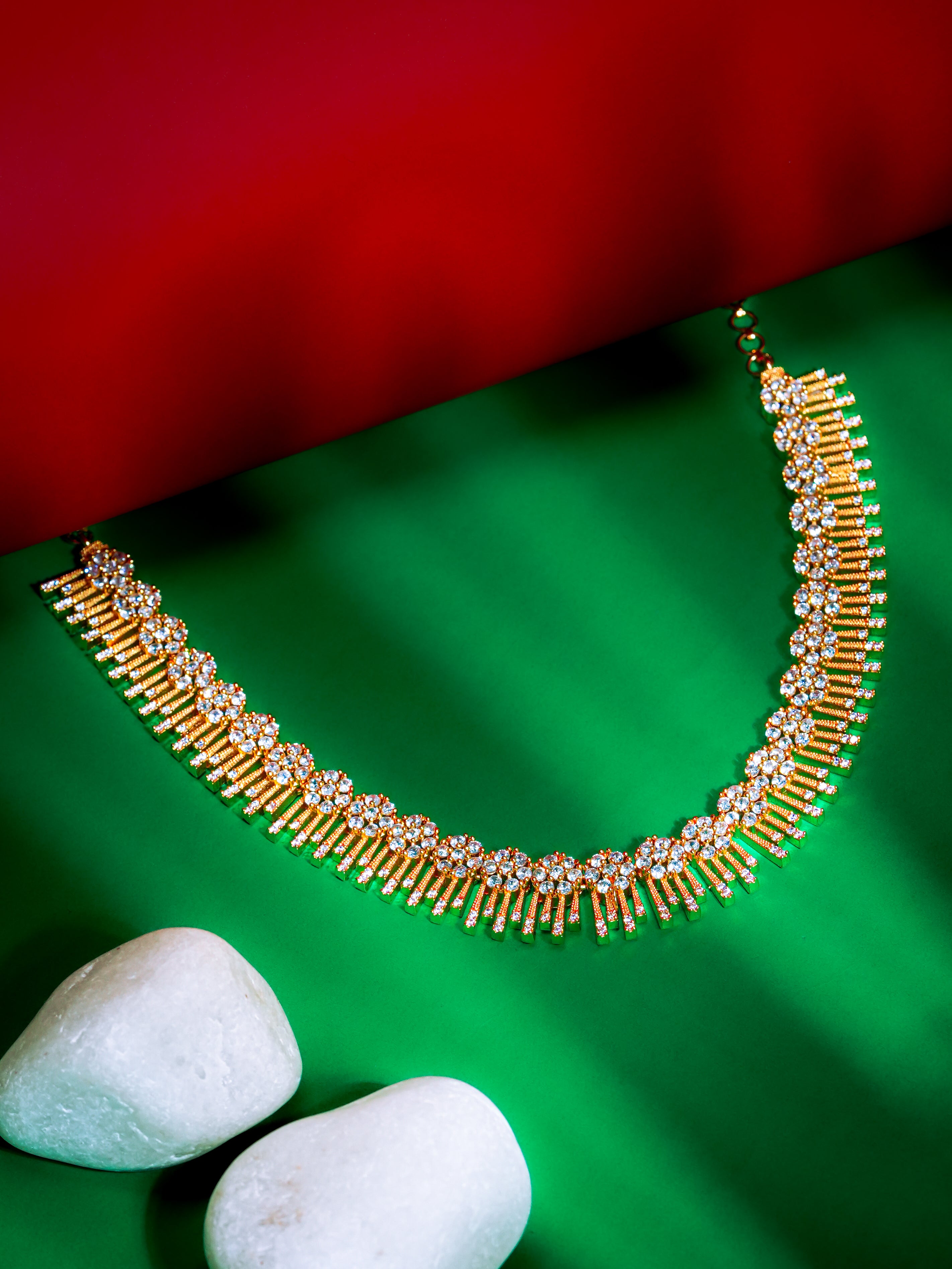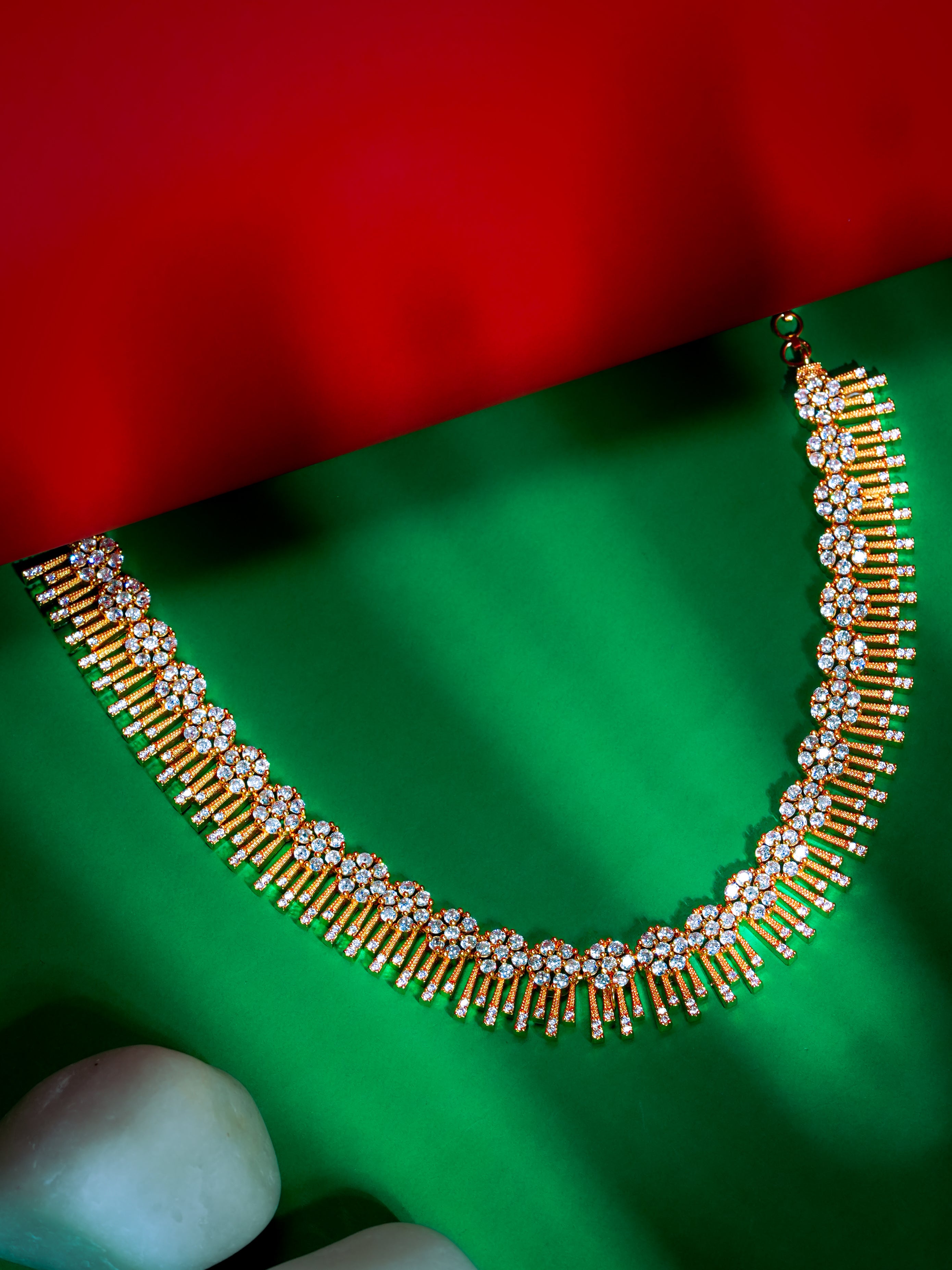 A classic beauty crafted for those who adore timeless sparkle. This gold-plated choker necklace features intricate floral clusters set with brilliant CZ stones, giving it a rich, heirloom-inspired glow. The lower edge is adorned with elegant vertical CZ fringes, adding movement, shine, and a festive charm to the piece.